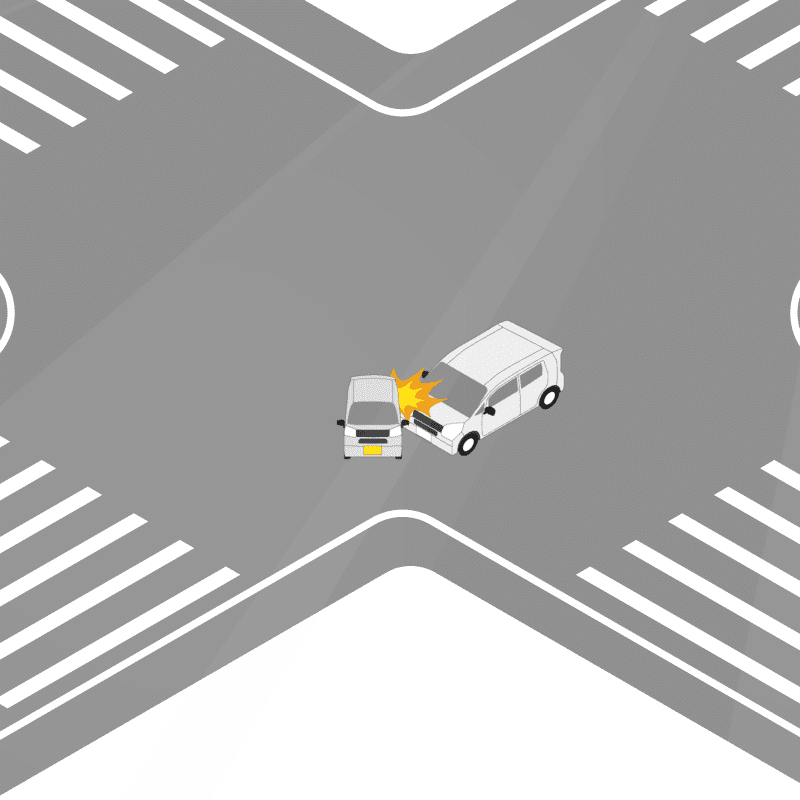 ・イラストに使用している各要素(車、背景、車、天候、信号、衝突地点など)は、代表的なイメージをイラスト化しており、色や形状等含め現実の事故の状況とは異なります。あくまで、事故のイメージとして参考までにご活用ください。
