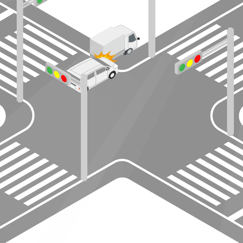 ・イラストに使用している各要素(車、背景、車、天候、信号、衝突地点など)は、代表的なイメージをイラスト化しており、色や形状等含め現実の事故の状況とは異なります。あくまで、事故のイメージとして参考までにご活用ください。