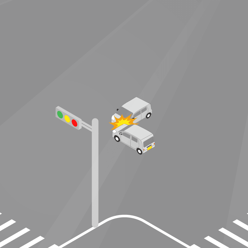 ・イラストに使用している各要素(車、背景、車、天候、信号、衝突地点など)は、代表的なイメージをイラスト化しており、色や形状等含め現実の事故の状況とは異なります。あくまで、事故のイメージとして参考までにご活用ください。