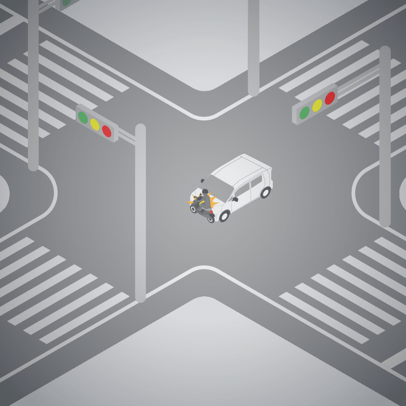 ・イラストに使用している各要素(車、背景、車、天候、信号、衝突地点など)は、代表的なイメージをイラスト化しており、色や形状等含め現実の事故の状況とは異なります。あくまで、事故のイメージとして参考までにご活用ください。