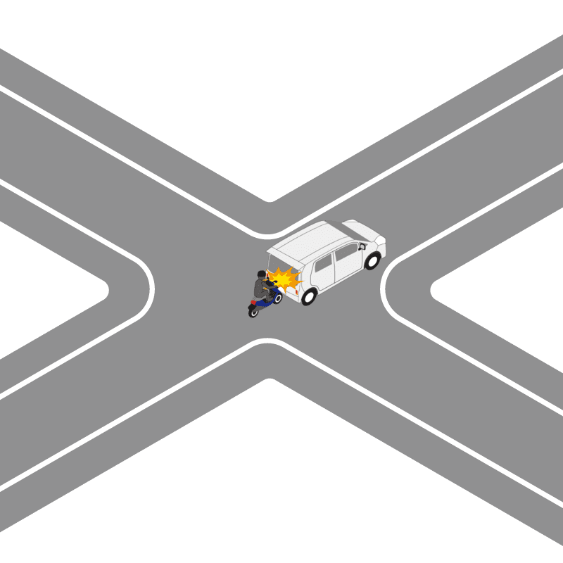 ・イラストに使用している各要素(車、背景、車、天候、信号、衝突地点など)は、代表的なイメージをイラスト化しており、色や形状等含め現実の事故の状況とは異なります。あくまで、事故のイメージとして参考までにご活用ください。
