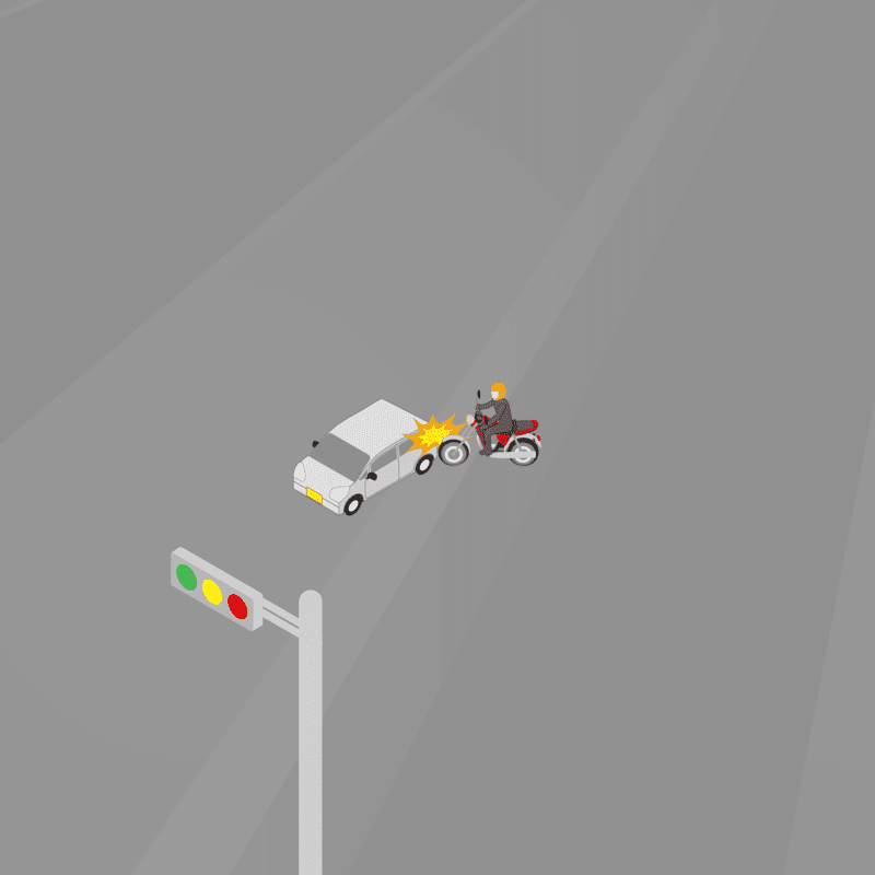 ・イラストに使用している各要素(車、背景、車、天候、信号、衝突地点など)は、代表的なイメージをイラスト化しており、色や形状等含め現実の事故の状況とは異なります。あくまで、事故のイメージとして参考までにご活用ください。