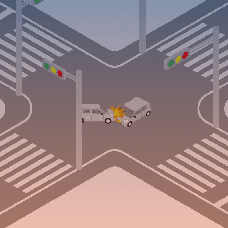 ・イラストに使用している各要素(車、背景、車、天候、信号、衝突地点など)は、代表的なイメージをイラスト化しており、色や形状等含め現実の事故の状況とは異なります。あくまで、事故のイメージとして参考までにご活用ください。