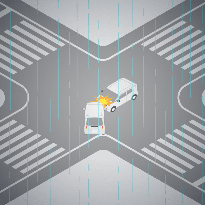 ・イラストに使用している各要素(車、背景、車、天候、信号、衝突地点など)は、代表的なイメージをイラスト化しており、色や形状等含め現実の事故の状況とは異なります。あくまで、事故のイメージとして参考までにご活用ください。