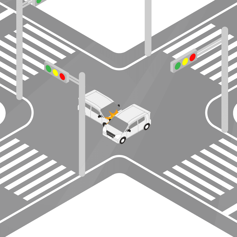 ・イラストに使用している各要素(車、背景、車、天候、信号、衝突地点など)は、代表的なイメージをイラスト化しており、色や形状等含め現実の事故の状況とは異なります。あくまで、事故のイメージとして参考までにご活用ください。