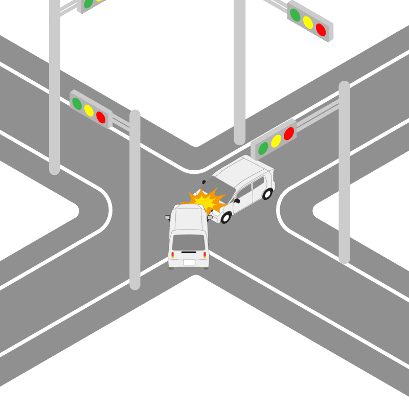 ・イラストに使用している各要素(車、背景、車、天候、信号、衝突地点など)は、代表的なイメージをイラスト化しており、色や形状等含め現実の事故の状況とは異なります。あくまで、事故のイメージとして参考までにご活用ください。