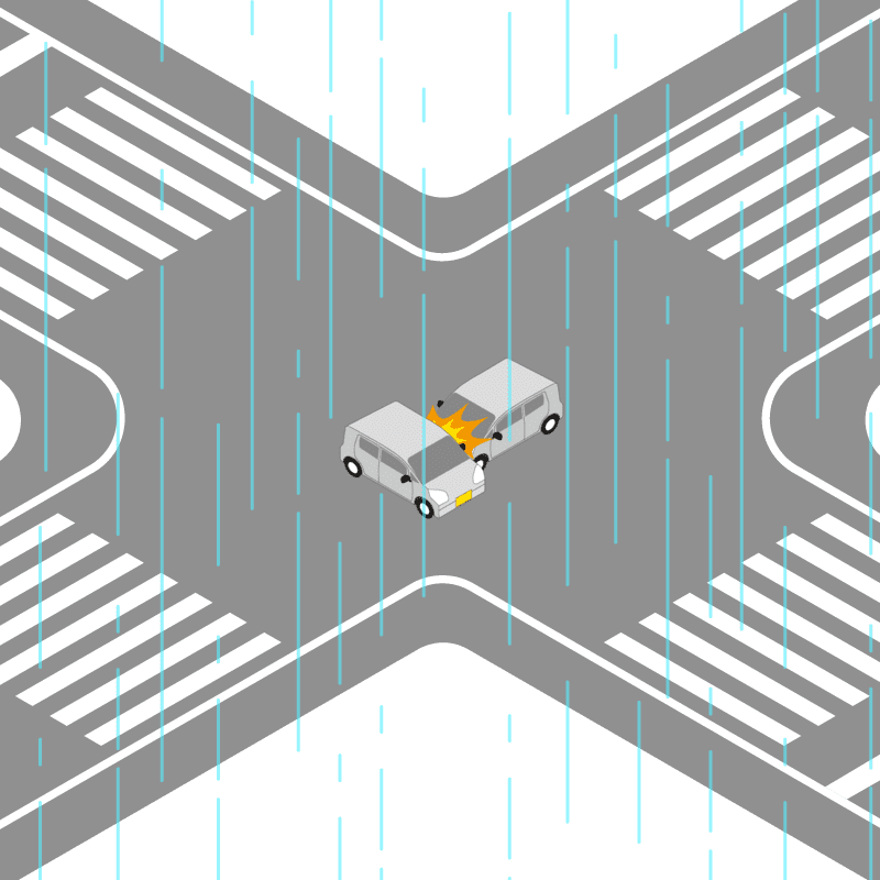 ・イラストに使用している各要素(車、背景、車、天候、信号、衝突地点など)は、代表的なイメージをイラスト化しており、色や形状等含め現実の事故の状況とは異なります。あくまで、事故のイメージとして参考までにご活用ください。