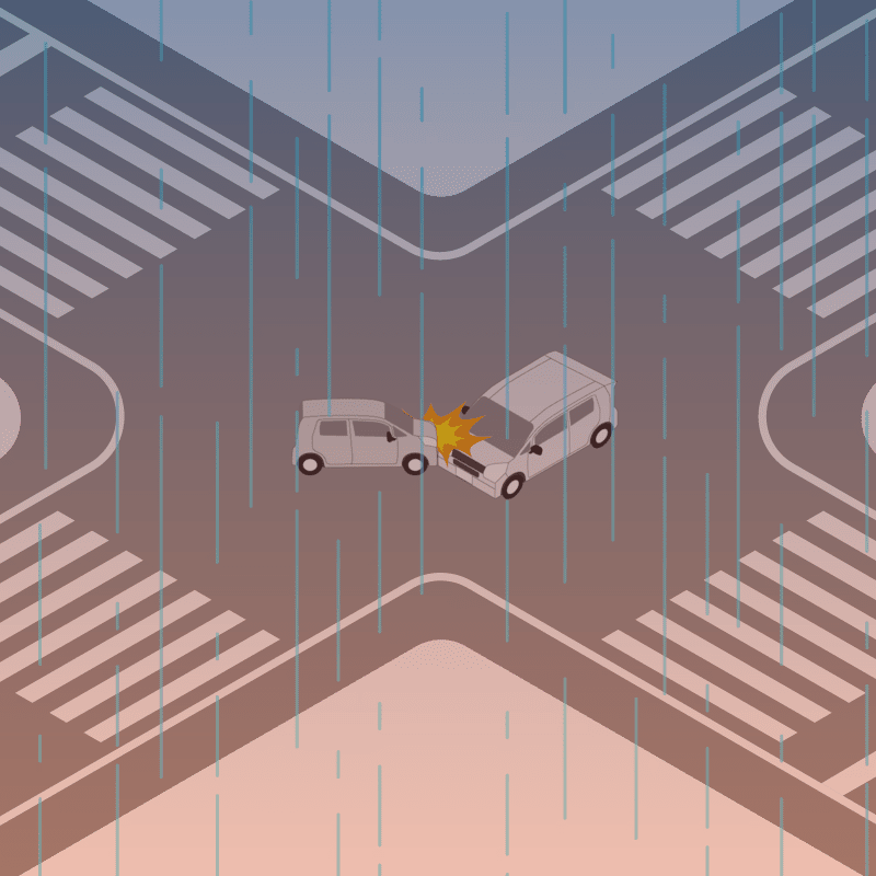 ・イラストに使用している各要素(車、背景、車、天候、信号、衝突地点など)は、代表的なイメージをイラスト化しており、色や形状等含め現実の事故の状況とは異なります。あくまで、事故のイメージとして参考までにご活用ください。