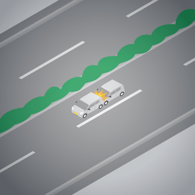 ・イラストに使用している各要素(車、背景、車、天候、信号、衝突地点など)は、代表的なイメージをイラスト化しており、色や形状等含め現実の事故の状況とは異なります。あくまで、事故のイメージとして参考までにご活用ください。