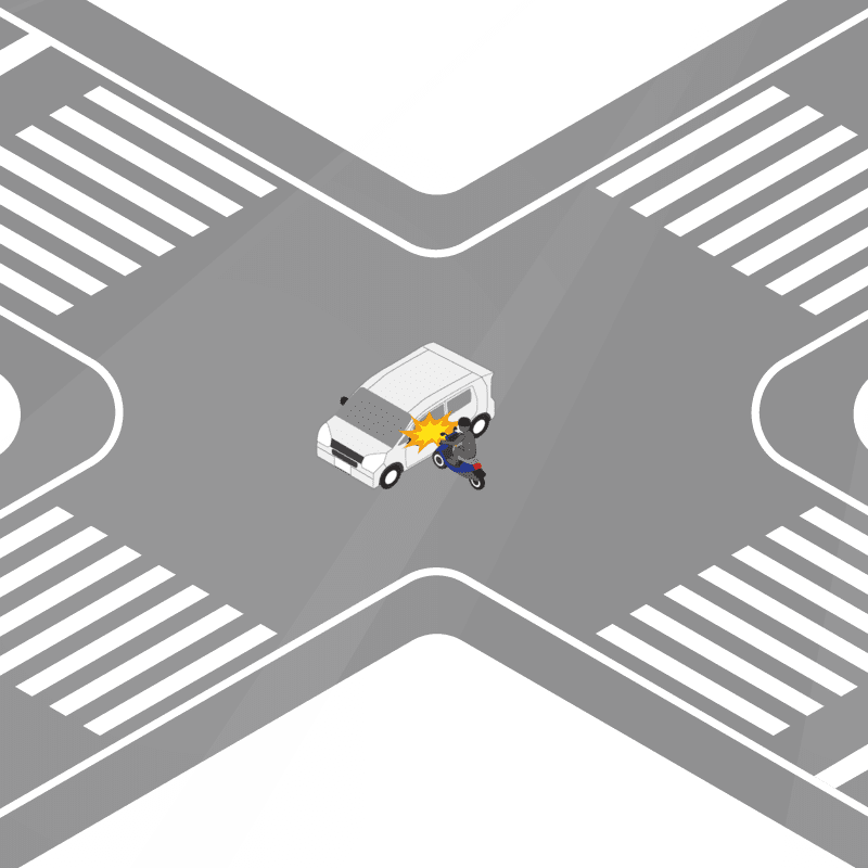 ・イラストに使用している各要素(車、背景、車、天候、信号、衝突地点など)は、代表的なイメージをイラスト化しており、色や形状等含め現実の事故の状況とは異なります。あくまで、事故のイメージとして参考までにご活用ください。