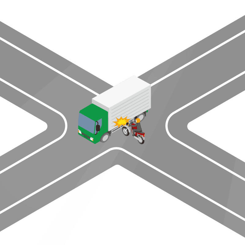 ・イラストに使用している各要素(車、背景、車、天候、信号、衝突地点など)は、代表的なイメージをイラスト化しており、色や形状等含め現実の事故の状況とは異なります。あくまで、事故のイメージとして参考までにご活用ください。