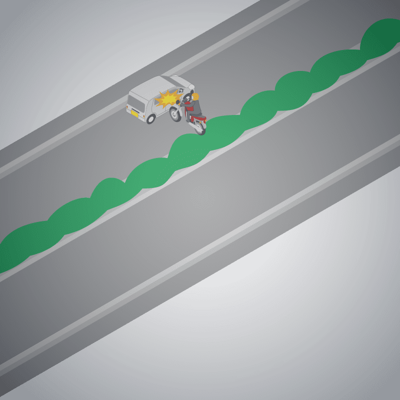 ・イラストに使用している各要素(車、背景、車、天候、信号、衝突地点など)は、代表的なイメージをイラスト化しており、色や形状等含め現実の事故の状況とは異なります。あくまで、事故のイメージとして参考までにご活用ください。