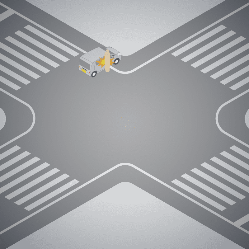 ・イラストに使用している各要素(車、背景、車、天候、信号、衝突地点など)は、代表的なイメージをイラスト化しており、色や形状等含め現実の事故の状況とは異なります。あくまで、事故のイメージとして参考までにご活用ください。