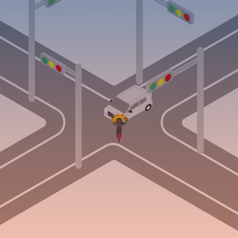 ・イラストに使用している各要素(車、背景、車、天候、信号、衝突地点など)は、代表的なイメージをイラスト化しており、色や形状等含め現実の事故の状況とは異なります。あくまで、事故のイメージとして参考までにご活用ください。