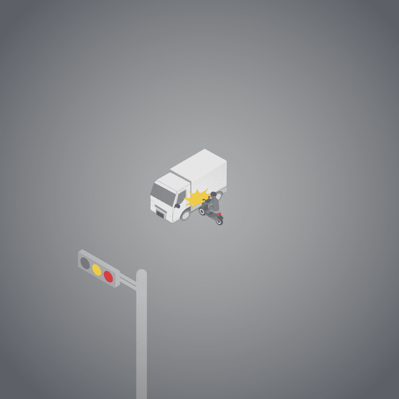 ・イラストに使用している各要素(車、背景、車、天候、信号、衝突地点など)は、代表的なイメージをイラスト化しており、色や形状等含め現実の事故の状況とは異なります。あくまで、事故のイメージとして参考までにご活用ください。