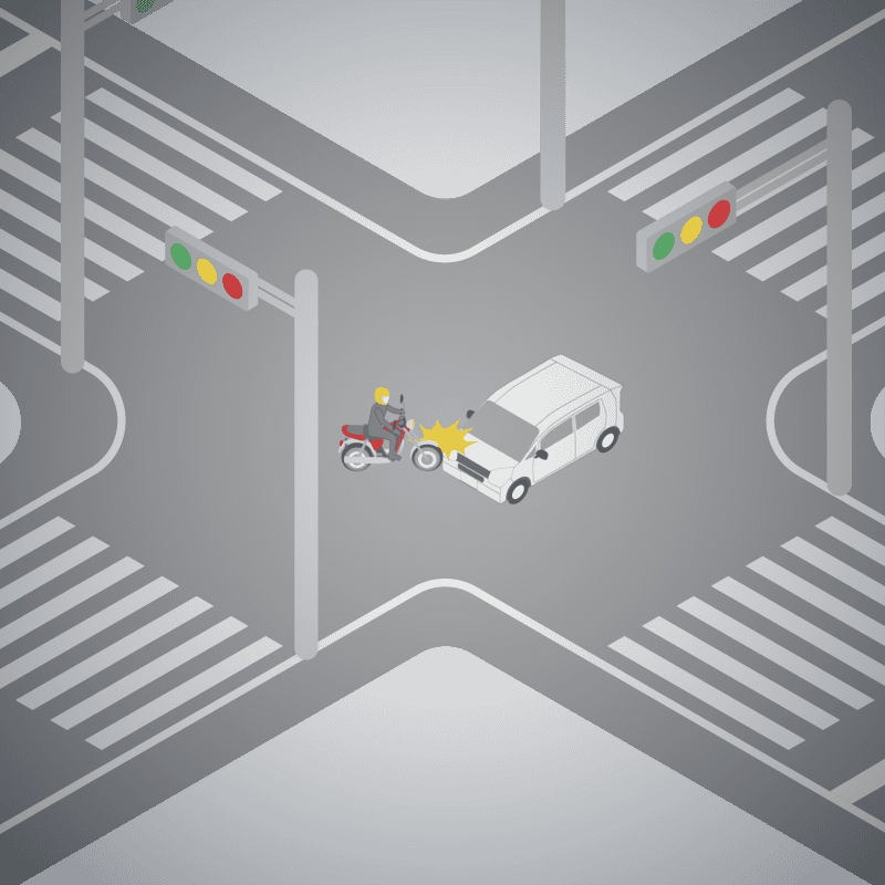 ・イラストに使用している各要素(車、背景、車、天候、信号、衝突地点など)は、代表的なイメージをイラスト化しており、色や形状等含め現実の事故の状況とは異なります。あくまで、事故のイメージとして参考までにご活用ください。