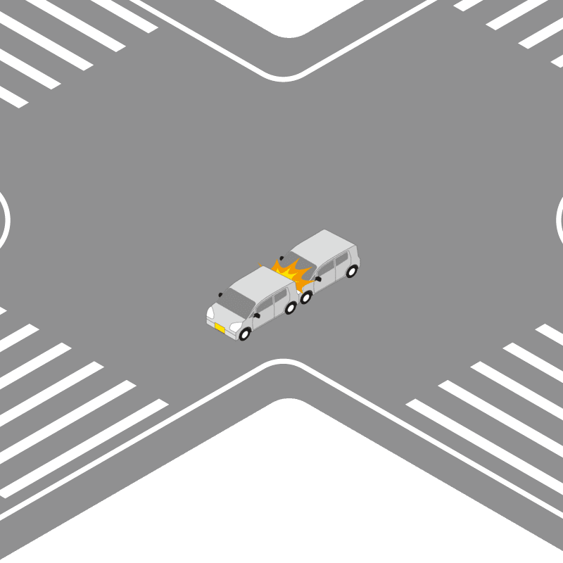 ・イラストに使用している各要素(車、背景、車、天候、信号、衝突地点など)は、代表的なイメージをイラスト化しており、色や形状等含め現実の事故の状況とは異なります。あくまで、事故のイメージとして参考までにご活用ください。