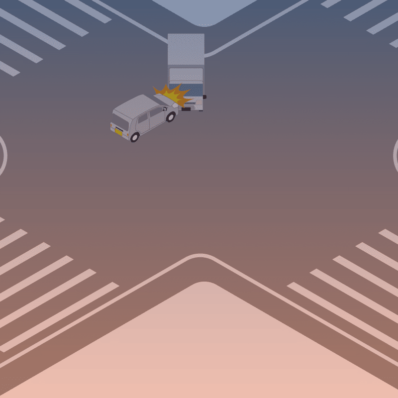 ・イラストに使用している各要素(車、背景、車、天候、信号、衝突地点など)は、代表的なイメージをイラスト化しており、色や形状等含め現実の事故の状況とは異なります。あくまで、事故のイメージとして参考までにご活用ください。