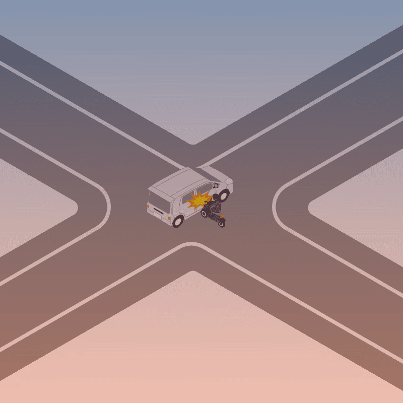 ・イラストに使用している各要素(車、背景、車、天候、信号、衝突地点など)は、代表的なイメージをイラスト化しており、色や形状等含め現実の事故の状況とは異なります。あくまで、事故のイメージとして参考までにご活用ください。