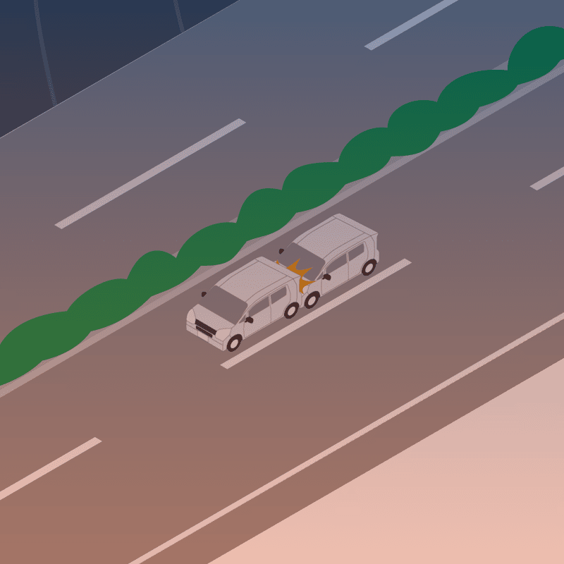・イラストに使用している各要素(車、背景、車、天候、信号、衝突地点など)は、代表的なイメージをイラスト化しており、色や形状等含め現実の事故の状況とは異なります。あくまで、事故のイメージとして参考までにご活用ください。