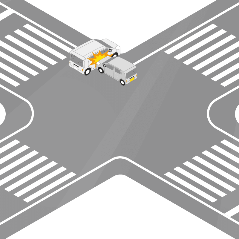 ・イラストに使用している各要素(車、背景、車、天候、信号、衝突地点など)は、代表的なイメージをイラスト化しており、色や形状等含め現実の事故の状況とは異なります。あくまで、事故のイメージとして参考までにご活用ください。