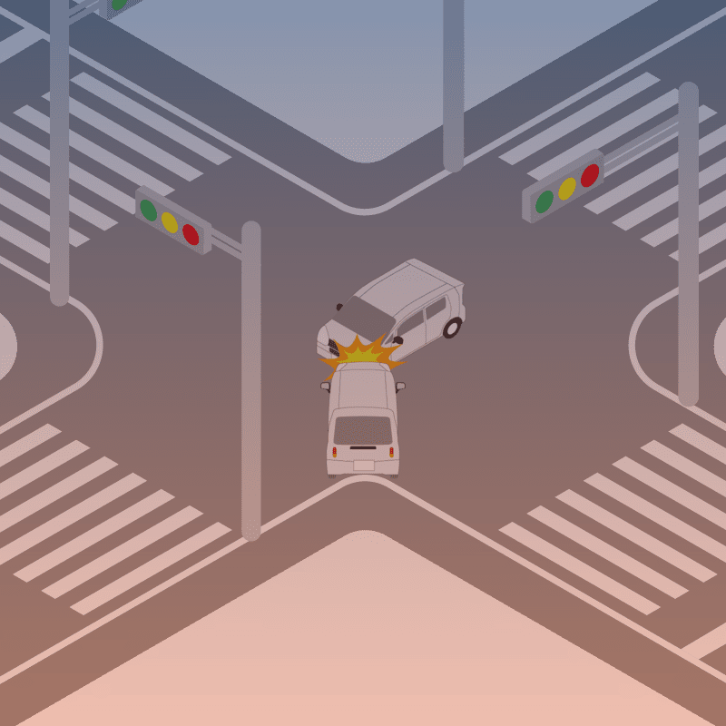 ・イラストに使用している各要素(車、背景、車、天候、信号、衝突地点など)は、代表的なイメージをイラスト化しており、色や形状等含め現実の事故の状況とは異なります。あくまで、事故のイメージとして参考までにご活用ください。