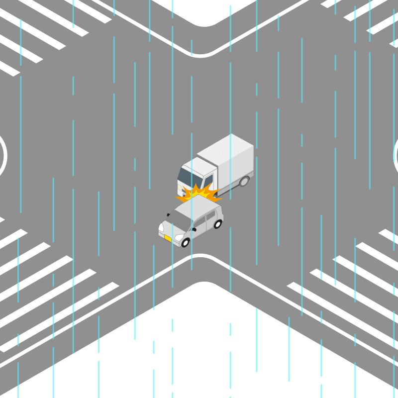 ・イラストに使用している各要素(車、背景、車、天候、信号、衝突地点など)は、代表的なイメージをイラスト化しており、色や形状等含め現実の事故の状況とは異なります。あくまで、事故のイメージとして参考までにご活用ください。