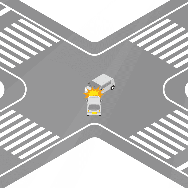 ・イラストに使用している各要素(車、背景、車、天候、信号、衝突地点など)は、代表的なイメージをイラスト化しており、色や形状等含め現実の事故の状況とは異なります。あくまで、事故のイメージとして参考までにご活用ください。