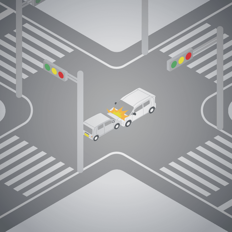 ・イラストに使用している各要素(車、背景、車、天候、信号、衝突地点など)は、代表的なイメージをイラスト化しており、色や形状等含め現実の事故の状況とは異なります。あくまで、事故のイメージとして参考までにご活用ください。