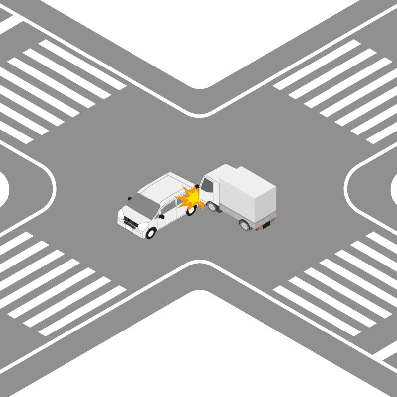 ・イラストに使用している各要素(車、背景、車、天候、信号、衝突地点など)は、代表的なイメージをイラスト化しており、色や形状等含め現実の事故の状況とは異なります。あくまで、事故のイメージとして参考までにご活用ください。
