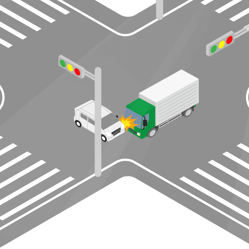 ・イラストに使用している各要素(車、背景、車、天候、信号、衝突地点など)は、代表的なイメージをイラスト化しており、色や形状等含め現実の事故の状況とは異なります。あくまで、事故のイメージとして参考までにご活用ください。