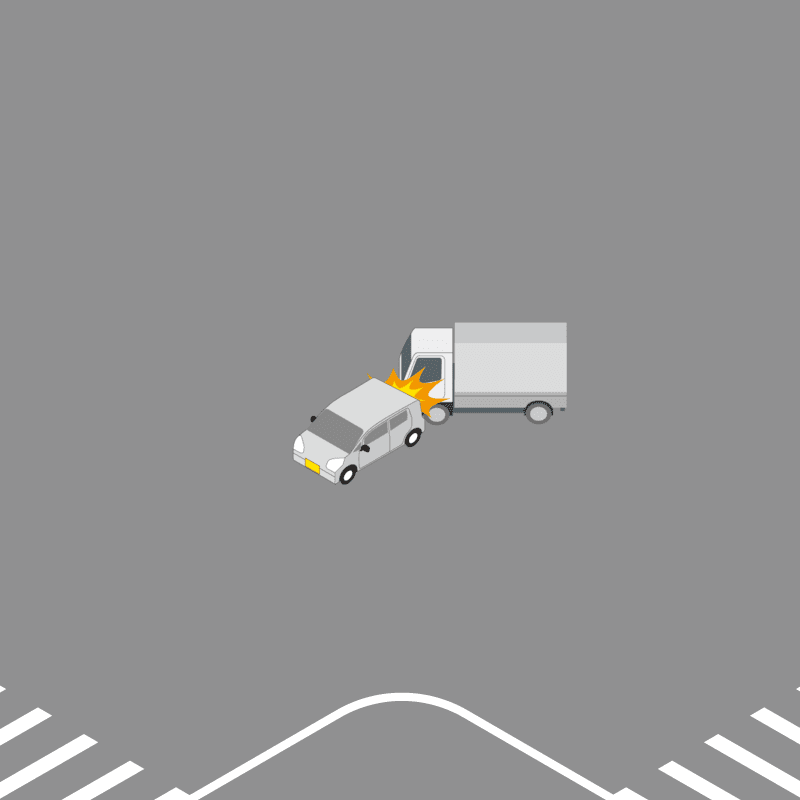・イラストに使用している各要素(車、背景、車、天候、信号、衝突地点など)は、代表的なイメージをイラスト化しており、色や形状等含め現実の事故の状況とは異なります。あくまで、事故のイメージとして参考までにご活用ください。
