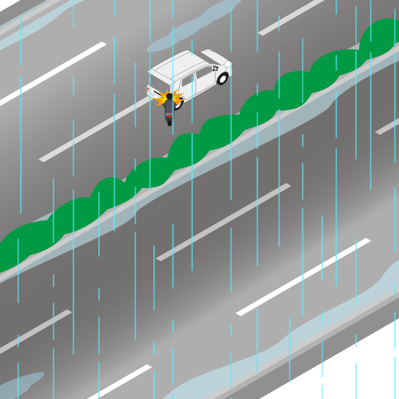 ・イラストに使用している各要素(車、背景、車、天候、信号、衝突地点など)は、代表的なイメージをイラスト化しており、色や形状等含め現実の事故の状況とは異なります。あくまで、事故のイメージとして参考までにご活用ください。