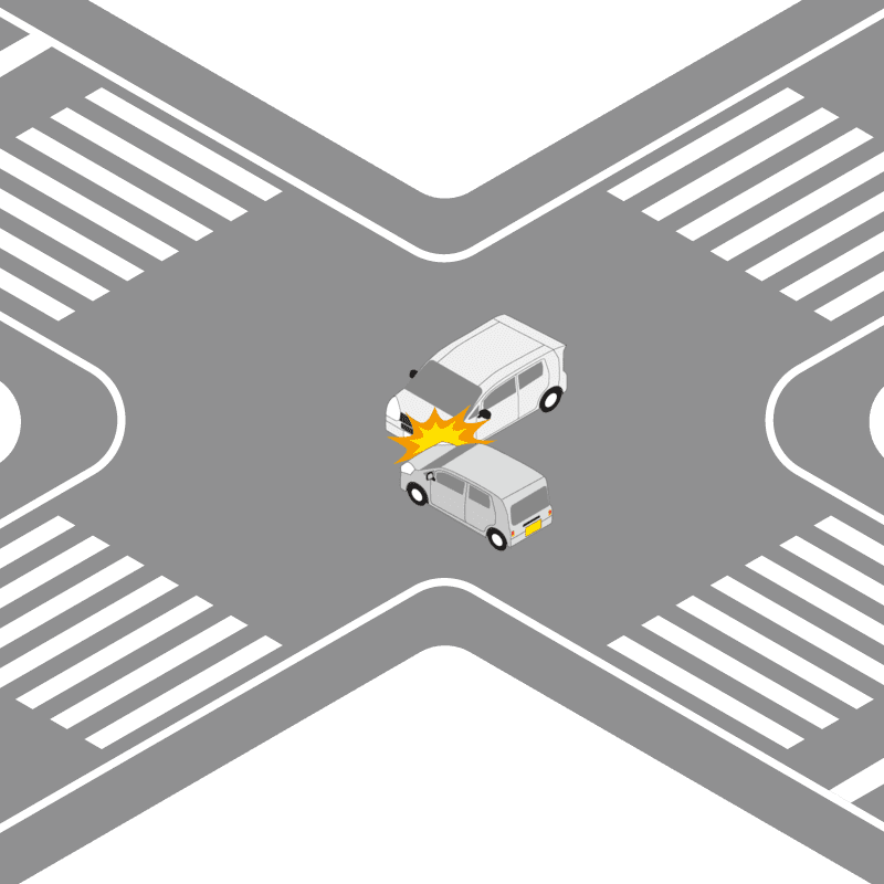 ・イラストに使用している各要素(車、背景、車、天候、信号、衝突地点など)は、代表的なイメージをイラスト化しており、色や形状等含め現実の事故の状況とは異なります。あくまで、事故のイメージとして参考までにご活用ください。