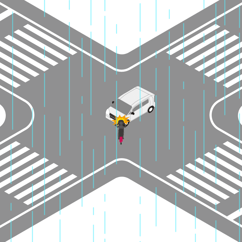・イラストに使用している各要素(車、背景、車、天候、信号、衝突地点など)は、代表的なイメージをイラスト化しており、色や形状等含め現実の事故の状況とは異なります。あくまで、事故のイメージとして参考までにご活用ください。