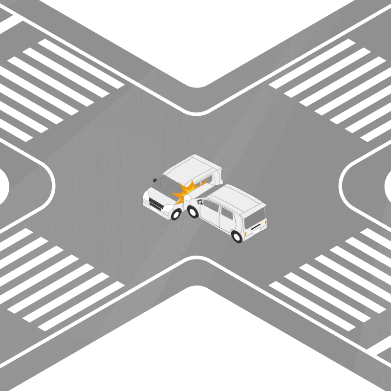 ・イラストに使用している各要素(車、背景、車、天候、信号、衝突地点など)は、代表的なイメージをイラスト化しており、色や形状等含め現実の事故の状況とは異なります。あくまで、事故のイメージとして参考までにご活用ください。