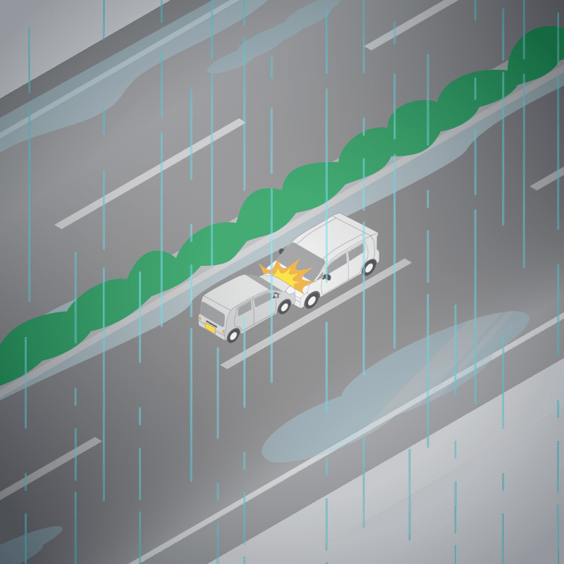 ・イラストに使用している各要素(車、背景、車、天候、信号、衝突地点など)は、代表的なイメージをイラスト化しており、色や形状等含め現実の事故の状況とは異なります。あくまで、事故のイメージとして参考までにご活用ください。