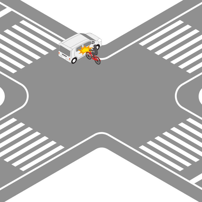・イラストに使用している各要素(車、背景、車、天候、信号、衝突地点など)は、代表的なイメージをイラスト化しており、色や形状等含め現実の事故の状況とは異なります。あくまで、事故のイメージとして参考までにご活用ください。