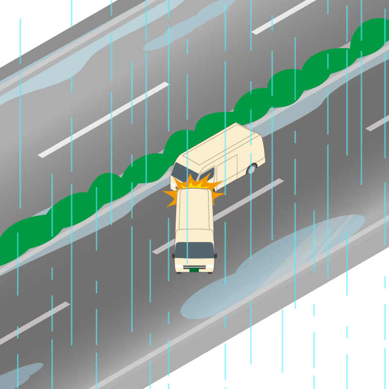 ・イラストに使用している各要素(車、背景、車、天候、信号、衝突地点など)は、代表的なイメージをイラスト化しており、色や形状等含め現実の事故の状況とは異なります。あくまで、事故のイメージとして参考までにご活用ください。