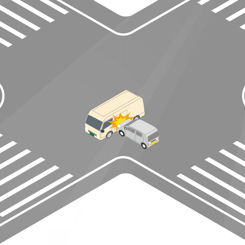 ・イラストに使用している各要素(車、背景、車、天候、信号、衝突地点など)は、代表的なイメージをイラスト化しており、色や形状等含め現実の事故の状況とは異なります。あくまで、事故のイメージとして参考までにご活用ください。