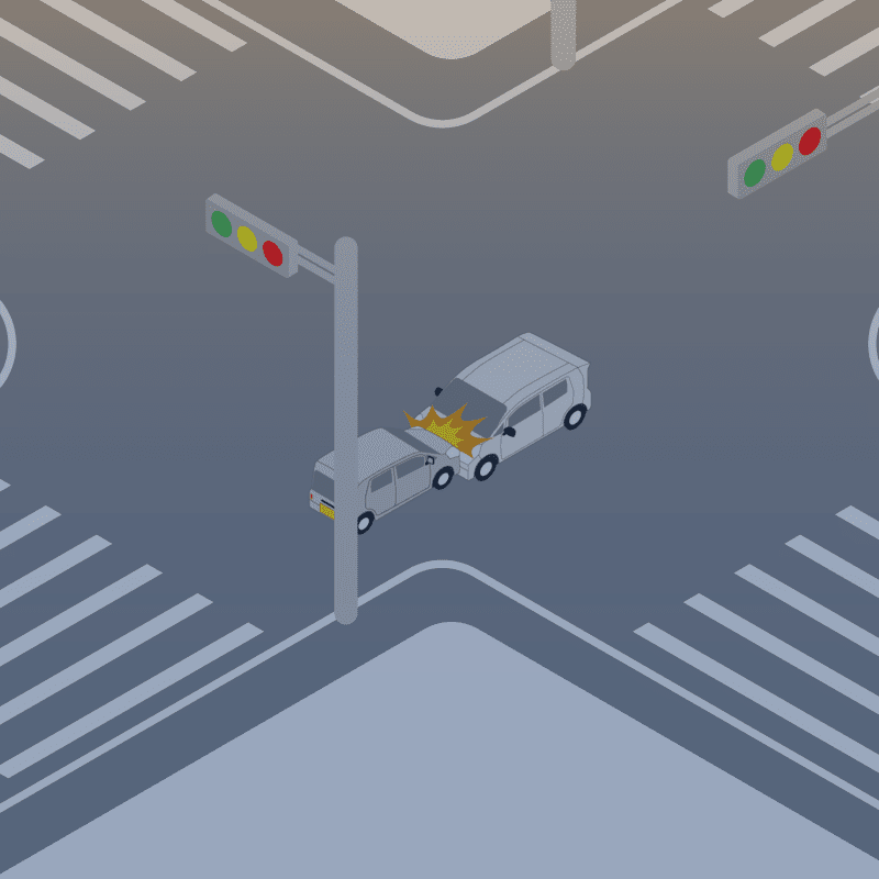・イラストに使用している各要素(車、背景、車、天候、信号、衝突地点など)は、代表的なイメージをイラスト化しており、色や形状等含め現実の事故の状況とは異なります。あくまで、事故のイメージとして参考までにご活用ください。