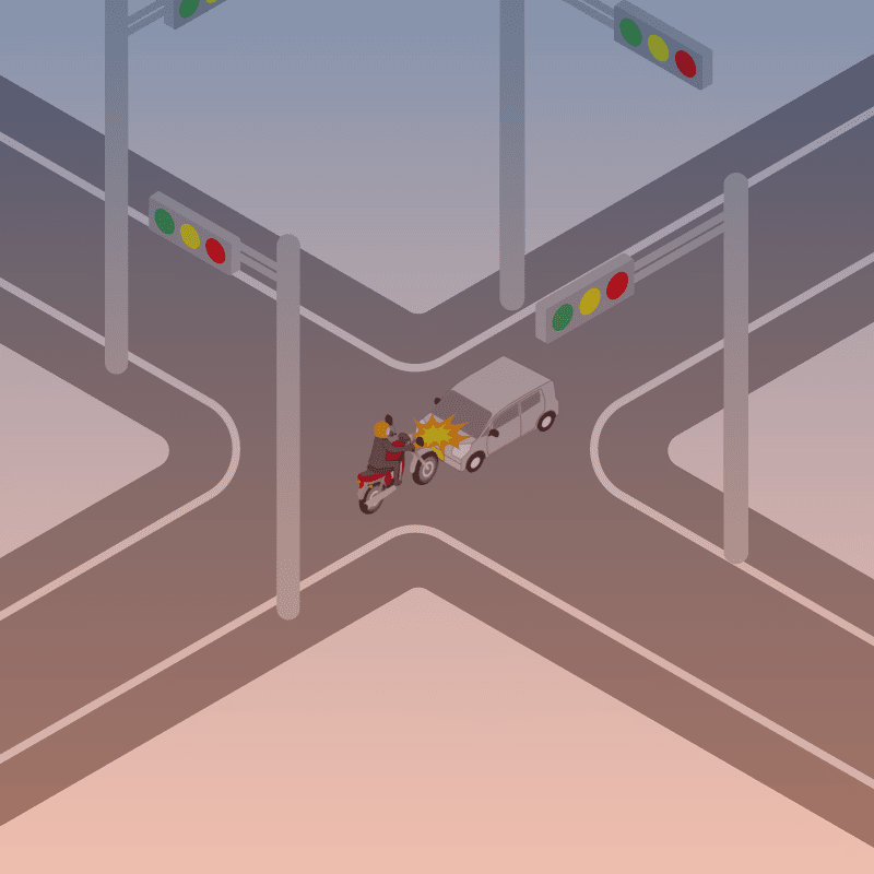 ・イラストに使用している各要素(車、背景、車、天候、信号、衝突地点など)は、代表的なイメージをイラスト化しており、色や形状等含め現実の事故の状況とは異なります。あくまで、事故のイメージとして参考までにご活用ください。