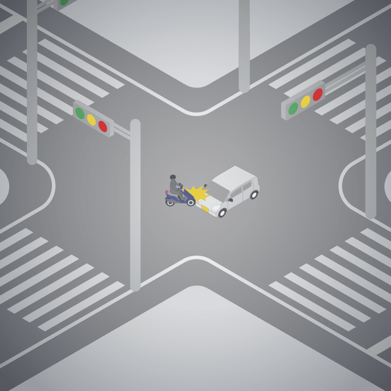 ・イラストに使用している各要素(車、背景、車、天候、信号、衝突地点など)は、代表的なイメージをイラスト化しており、色や形状等含め現実の事故の状況とは異なります。あくまで、事故のイメージとして参考までにご活用ください。