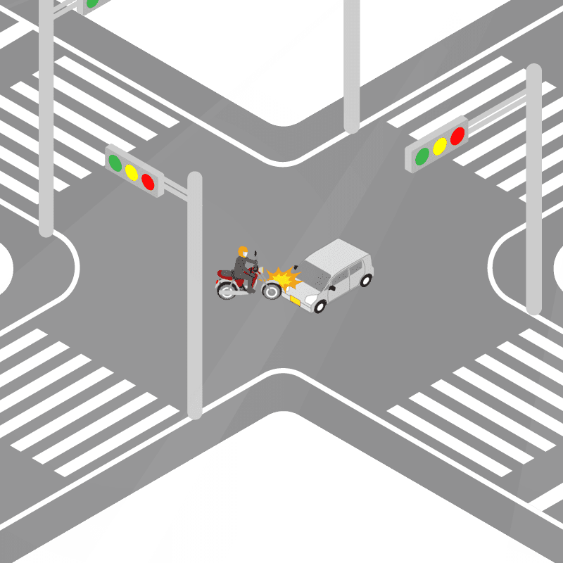 ・イラストに使用している各要素(車、背景、車、天候、信号、衝突地点など)は、代表的なイメージをイラスト化しており、色や形状等含め現実の事故の状況とは異なります。あくまで、事故のイメージとして参考までにご活用ください。