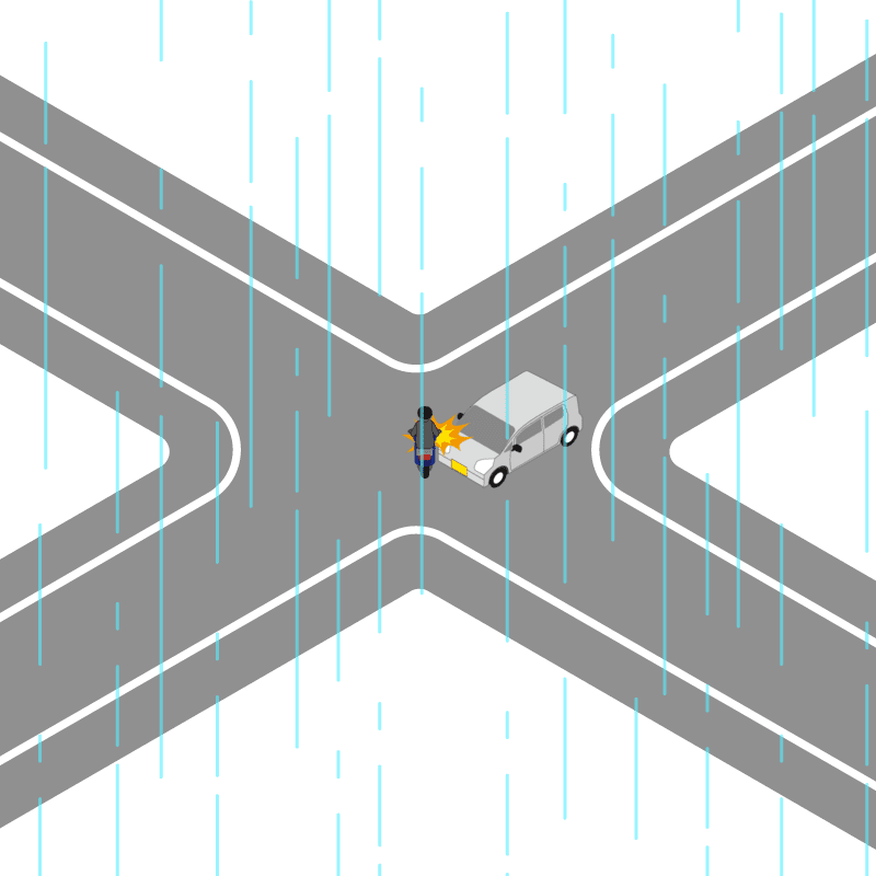 ・イラストに使用している各要素(車、背景、車、天候、信号、衝突地点など)は、代表的なイメージをイラスト化しており、色や形状等含め現実の事故の状況とは異なります。あくまで、事故のイメージとして参考までにご活用ください。