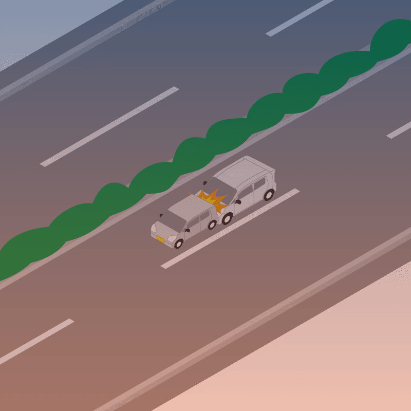・イラストに使用している各要素(車、背景、車、天候、信号、衝突地点など)は、代表的なイメージをイラスト化しており、色や形状等含め現実の事故の状況とは異なります。あくまで、事故のイメージとして参考までにご活用ください。