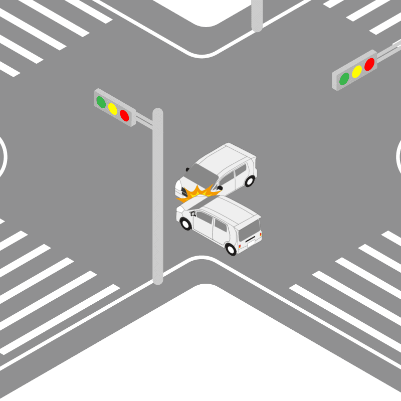 ・イラストに使用している各要素(車、背景、車、天候、信号、衝突地点など)は、代表的なイメージをイラスト化しており、色や形状等含め現実の事故の状況とは異なります。あくまで、事故のイメージとして参考までにご活用ください。