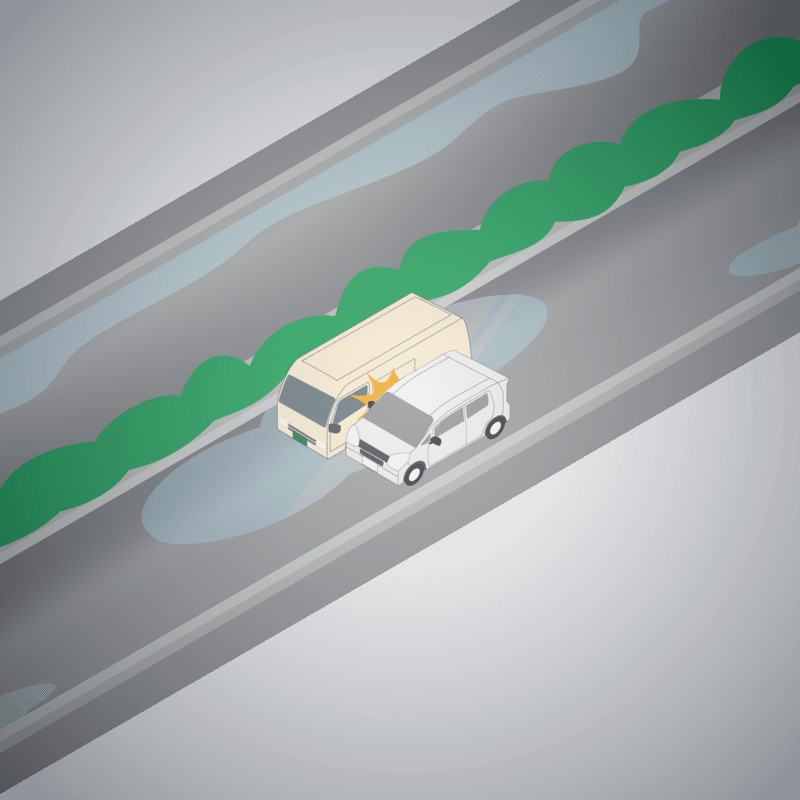 ・イラストに使用している各要素(車、背景、車、天候、信号、衝突地点など)は、代表的なイメージをイラスト化しており、色や形状等含め現実の事故の状況とは異なります。あくまで、事故のイメージとして参考までにご活用ください。