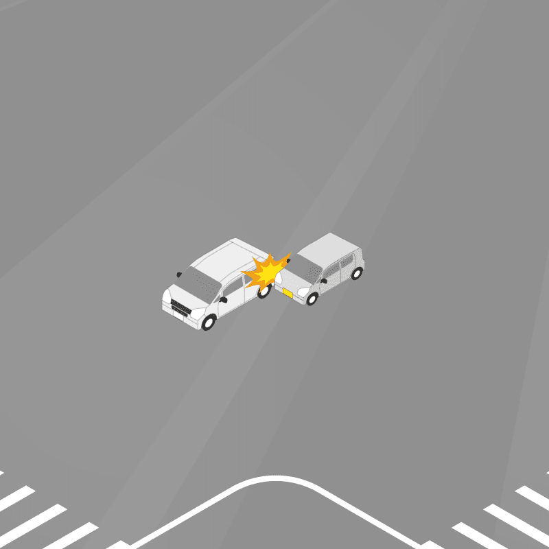 ・イラストに使用している各要素(車、背景、車、天候、信号、衝突地点など)は、代表的なイメージをイラスト化しており、色や形状等含め現実の事故の状況とは異なります。あくまで、事故のイメージとして参考までにご活用ください。