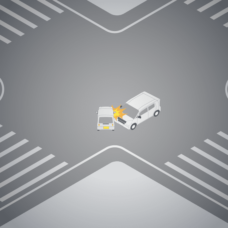 ・イラストに使用している各要素(車、背景、車、天候、信号、衝突地点など)は、代表的なイメージをイラスト化しており、色や形状等含め現実の事故の状況とは異なります。あくまで、事故のイメージとして参考までにご活用ください。